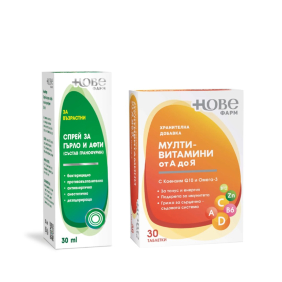 НОВЕ ФАРМ КОМПЛЕКТ СПРЕЙ ЗА ГЪРЛО И АФТИ ЗА ВЪЗРАСТНИ 30МЛ + МУЛТИВИТАМИНИ + КОЕНЗИМ Q10 И ОМЕГА-3
