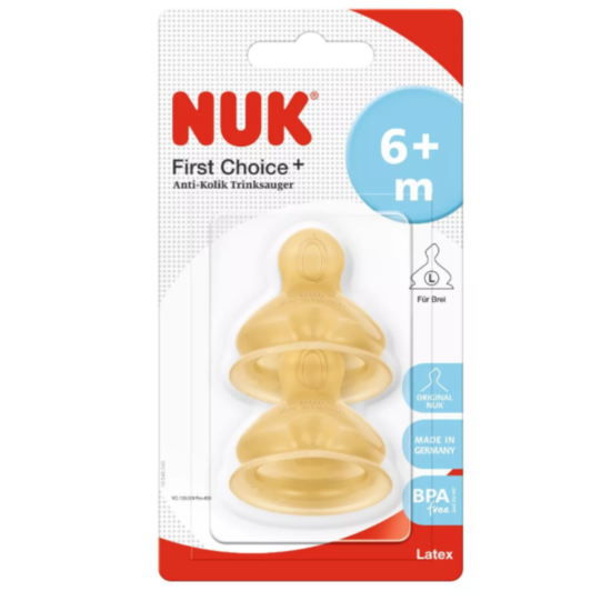 Биберонът от NUK First Choice+ е изработен от хранителен каучук и е подходящ за деца от 6 до 18 месеца. Благодарение на функцията си против колики, той осигурява непрекъснато и продължително хранене на бебето.