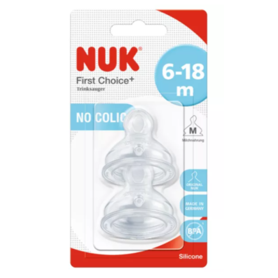 Бибероните на NUK са размер M, който е подходящ за мляко. Те имат клапа против колики и са подходящи за деца от 6 до 18 месеца.