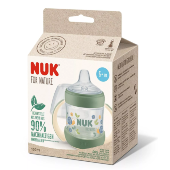 NUK for Nature PP шише за сок 150мл силиконов неразливащ накрайник, 6-18мес. Материалите са 100% свързани с възобновяеми естествени суровини. Съответства на Подхода на масовия баланс и е сертифициран по ISCC PLUS за пластмасата и REDcert2 за силикона. Temperature control – интегрираната скала показва температурата на храната: оцветена в бяло – горещо, средно наситено синьо – 37 градуса, тъмно синьо – студено.