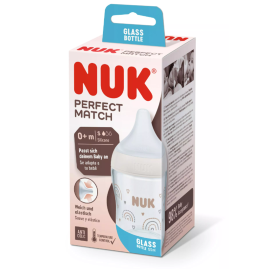 NUK PERFECT MATCH стъклено шише Temperature control 120мл, биберон силикон 3+м., S - 1 капка /слаб поток на течността за най-малките/.