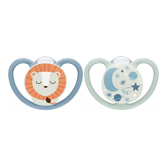 Силиконовият биберон NUK - Space Night свети в тъмното, за да помогне на вас и вашето бебе да го открие по-лесно. Светещият материал излъчва мека светлина, която не пречи на спокойния сън, но помага за намирането.