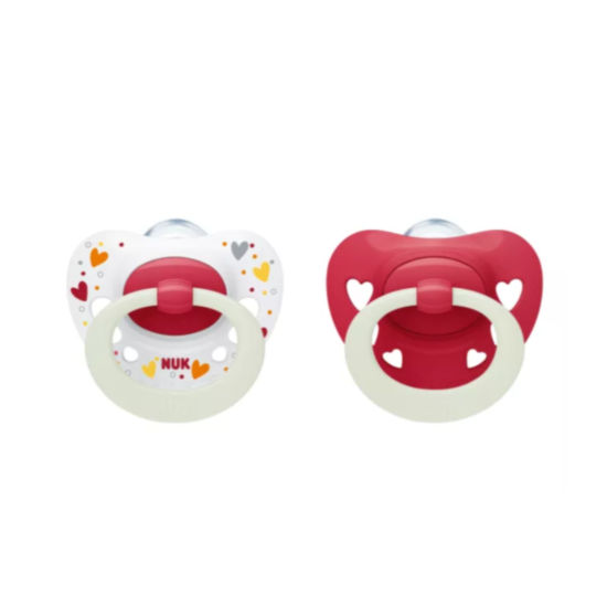 NUK Signature Night залъгалка силикон, идеално пасваща на челюстта - Оригиналната NUK форма – анатомично оформена и с практичен ринг Ринг– безвреден лек материал. - Тънка и уширена основа на залъгалката – намалява напрежението върху челюстта и зъбите. - Кутийка за многократна употреба, която е удобна за транспортиране и предпазва от замърсяване. - По-плоска повърхност към езика и по-гладка долна част – за повече свобода на езика да извършва естественото сукателно движение NUK светеща в тъмното залъгалка NUK светещата в тъмното залъгалка помага на бебето да открие по-лесно Страната на сънищата. Благодарение на светещия безопасен за бебето материал, залъгалката излъчва мека светлина и може лесно да бъде открита и през нощта. NUK Signature Night силиконова залъгалка: моделирана, както майчиното зърно по време на кърмене. За малкото бебе има много вълнуващи приключения всеки ден. За него залъгалката е приятел, на който то може да разчита, за да получи сигурност и спокойствие, докато я суче. Независимо дали става дума за непознати лица или звуци, които разстройват бебето, сукането на залъгалка е много успокоително за него. За да се оптимизира още повече този фактор за доброто усещане на бебето и това сукане да бъде полезно за него, NUK залъгалката е с усъвършенствана форма, която допринася за правилното развитие на челюстта. Тя е моделирана като майчиното зърно по време на кърмене, за да пасва оптимално на устата на детето. Бебетата по тази причина приемат NUK залъгалката много бързо.