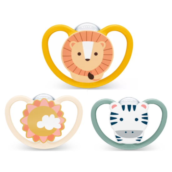 Симпатичните 3D мотиви с животинчета се предлагат в практична опаковка, която може да се използва и като кутийка за съхранение. Просто пуснете кутийката в своята чанта или чантата на бебето и вие ще имате NUK Space залъгалката в точния момент. Кутийката е подходяща и за стерилизиране на залъгалката в микровълновата фурна. И така, наслаждавайте се на своята малка залъгалка – животинче за дълго време.
