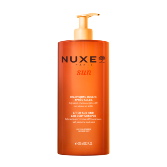 Душ гел и шампоан Нукс Афтър Сън нежно почиства кожата и косата, премахвайки всички остатъци от замърсявания: UV филтри, сол, хлор и пясък. Подходящ за всички типове кожа и коса. Nuxe After Sun за тяло и коса оставя кожата мека и ухаеща, а косата - светла и блестяща. Образува кремообразна пяна с аромат на сладък портокал, цвете тиаре и ванилия. Продукт 2 в 1, лесен за употреба, веган формула с 95% съставки от естествен произход.