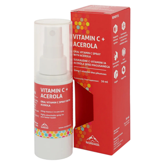 Основен компонент във формулата на пероралият спрей с витамин С на Nordaid е суперплодът ацерола. Един от най- концентрираните естествени източници на витамин С на планетата. Благодарение на невероятната си хранителна стойност, черешата ацерола, доставя не само естествен витамин С, но и изключително богат набор от фитонутриенти - каротеноиди, феноли, флавоноиди и антоцианини, минералите желязо, фосфор и калций, както и двойно по- голяма мощ за повишаване на имунитета. Като антиоксидант насърчава имунния отговор и помага на тялото да се предпази от оксидативния стрес.