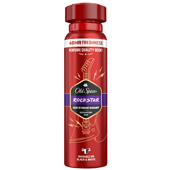 Мъжкият део спрей Rockstar от Old Spice Ви предлага до 48 часа свежест и увереност. Бобеждава Той ефективно се бори с неприятните миризми, като не оставя петна по черните и белите дрехи. Неговият цитрусов аромат с бергамот и свежа ябълка, комбиниран с дървесни нотки, Ви гарантира изключителна свежест