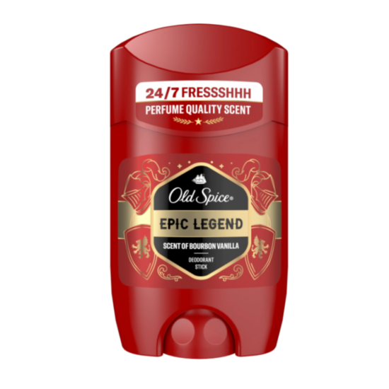 Део стик Old Spice Epic Legend е създаден специално за мъже и осигурява ефективна защита срещу изпотяване и поява на неприятни миризми. Оставя дълготрайно усещане за свежест и комфорт. Интензивният мъжествен аромат комбинира нотки на бурбонска ванилия. Специалната формула е изключително деликатна към кожата и не оставя следи върху белите и цветни дрехи.