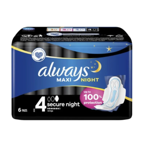 Always Secure Night Дамски превръзки са предназначени да осигурят комфорт, сигурност и защита по време на месечния цикъл на жената. Олуейс Секюр Найт Дамски превръзки са проектирани с абсорбиращ слой, който превръща течността в гел. Зоната на интимната област остава суха и чиста. Превръзките са с крилца, които прилепват плътно върху бельото и не позволяват на течността да протече.