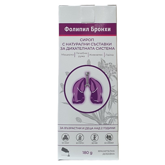 ОМЕГА ВИТА ФОЛИПИЛ БРОНХИ СИРОП 180МЛ е хранителна добавка от Omega Vita, с натурални съставки за дихателната система. Оригинална рецепта с приятен вкус, включила синергията на билките мащерка, лечебна ружа, теснолист живовлек и лайка , за да окаже редица благоприятни за дихателната система действия. Подходящ за вегани. Подходящ за диабетици. За възрастни и деца над 2 години.