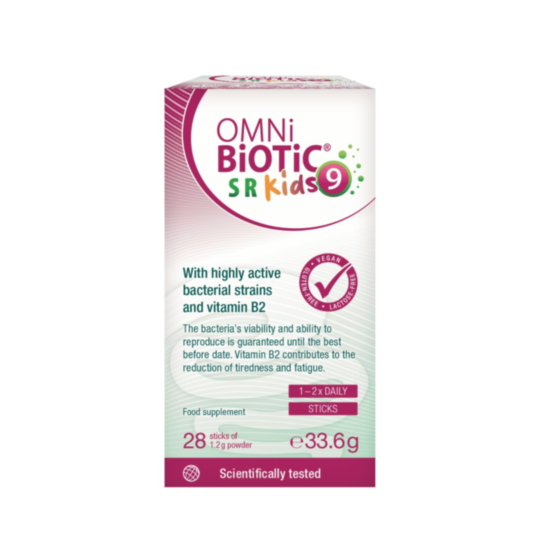 Omni-Biotic SR 9 Kids е хранителна добавка, която включва в състава си 9 естествено срещащи се в човешките черва бактериални щама. Червата ни са заселени с трилиони чревни симбионти от множество бактериални щамове. Голямото многообразие в червата е от голямо значение, защото различните щамове изпълняват различни функции. Добавеният витамин В2 допринася за намаляване на чувството на отпадналост и умора.