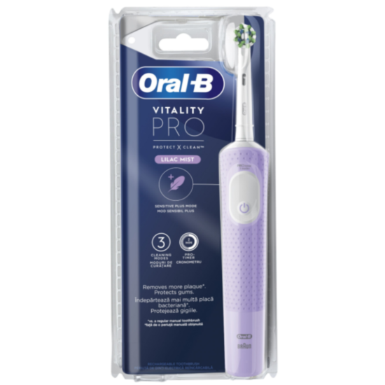 ОРАЛ-Б ЧЕТКА ЗА ЗЪБИ ЕЛЕКТРИЧЕСКА VITALITY PRO ЛИЛАВ  е електрическа четка за зъби с три режима на действие. Може да  персонализирате вашето четкане: ежедневно почистване, чувствителнo и чувствителнo плюс. Таймерът ви помага да четкате по-дълго време за 2 минути, препоръчани от зъболекарите, а батерията издържа до 10 дни с 1 зареждане.