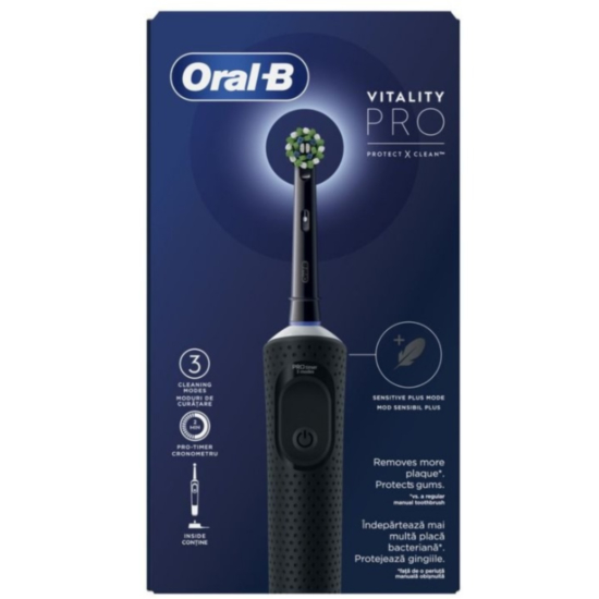 ОРАЛ-Б ЕЛЕКТРИЧЕСКА ЧЕТКА ЗА ЗЪБИ D103 PRO BLACK 6/21/6 е електрическа четка за зъби, която надежднo отстранява натрупаната плака, замърсяванията и бактериите. Специалните влакна достигат дори и най-труднодостъпните места и са изключително деликатни към венците. Четката е с водоустойчив корпус и има 3 режима на работа: Daily Clean, Sensitive и Sensitive Plus. Ергономичната дръжка позволява удобен захват и предотвратява вероятността от изплъзване. Наслаждавайте се на добре почистени и защитени зъби, свеж дъх и искрящо бяла усмивка с Oral-B