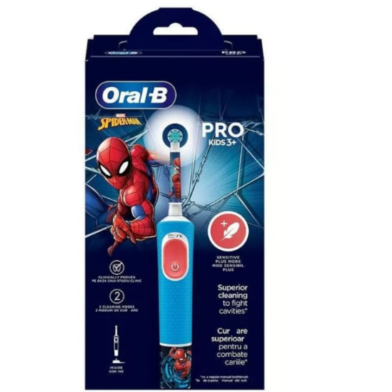 ОРАЛ-Б ЕЛЕКТРИЧЕСКА ЧЕТКА ЗА ЗЪБИ PRO KIDS SPIDERMAN 3+ 6/15/6 е електрическа четка за зъби, подходяща за деца над 3 години. Атрактивният дизайн в съчетание с усъвършенстваната технология за почистване и вграденият 2-минутен таймер насърчават децата да развият трайни навици за добра устна хигиена. Четката разполага със специален режим на нежно почистване, който е подходящ за най-малките; премахва деликатно плаката и предотвратява появата на кариеси. Моделът предлага функция за контрол на натиска – ако е прекалено силен, четката сигнализира мигновено и спира пулсиращите движения, за да защити венците. Батерията издържа до 30 минути след пълно зареждане. В опаковката са включени 4 различни стикера със SPIDER-MAN, с които детето да персонализира и стилизира четката си.