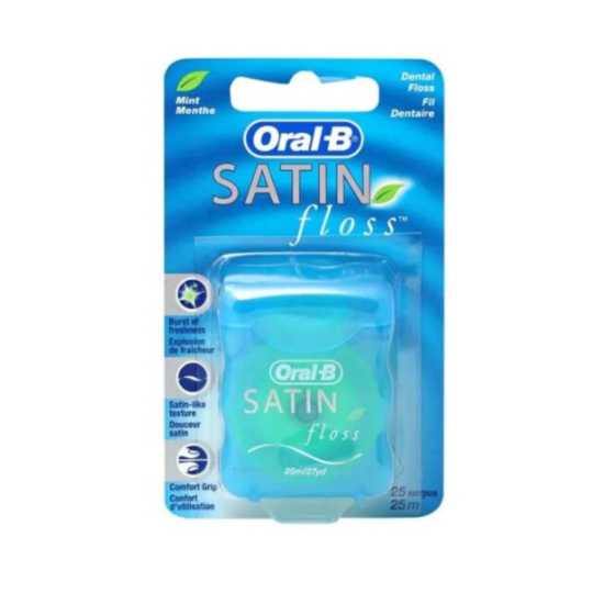 ОРАЛ-Б КОНЕЦ ЗА ЗЪБИ SATIN FLOSS 25М МЕНТА е висококачествен конец за зъби, достигащ до труднодостъпните междузъбни пространства. С него лесно и ефикасно поддържате зъбите си чисти, здрави и красиви. Конецът премахва успешно плаката, подходящ е за ползване след хранене или по което и да е време на деня - за допълнително почистване. Има удобен захват за бърза и лесна употреба. Предотвратява замърсяванията и плаката във венечните джобове и междузъбните пространства. Така възможността за образуването на кариеси значително намалява.