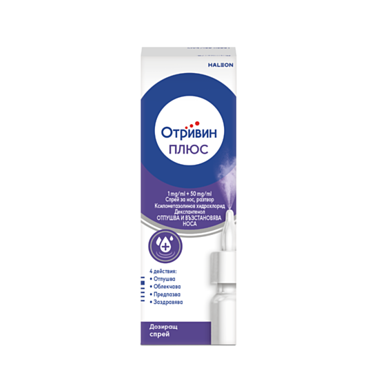Спреят за нос Отривин плюс e подходящ за възрастни и юноши над 12 години. Той действа за намаляване на отока на носната лигавица, при ринит и като подпомагащо лечение за заздравяване на рани по кожата и лигавиците. Приложим за облекчаване на хремата (горен ринит) и за третиране на запушен нос след операция на носа. Otrivin се прилага и за намаляване на отока на носната лигавица при ринит, свързан с остро възпаление на синусите (риносинузит). Благодарение на активната си съставка, ксилометазолинов хидрохлорид, разтворът свива кръвоносните съдове, водейки до намаляване на отока на носната лигавица. Съдържа и активната съставка декспантенол, която защитава лигавицата и спомага за заздравяване на раните. Предлага се в опаковка от 10 мл.