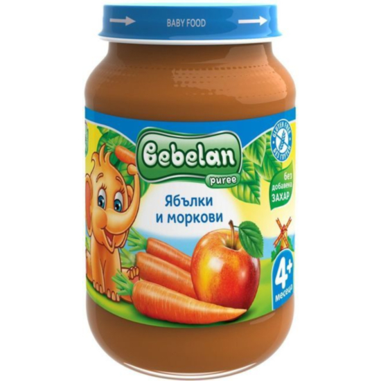 БЕБЕЛАН 2641/1168 ЯБЪЛКИ И МОРКОВИ 190г 4м+ - Плодовото пюре с ябълки и моркови на марката Bebelan е подходящо за бебета над 4-месечна възраст. Пюрето е пастьоризирано и еднокомпонентно. Съдържа 82.4% плодово съдържание, естествени захари и Витамин С. Без глутен и добавена захар.
