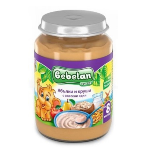 БЕБЕЛАН 4398 ПЮРЕ ЯБЪЛКИ,КРУШИ,ОВЕСЕНИ ЯДКИ И МЛЯКО 8М+ 190ГР. е стерилизиран плодово-млечен десерт с овесени ядки за кърмачета от 8-месечна възраст. Идеален за сутрешна или следобедна закуска. Без добавени захар и сол.