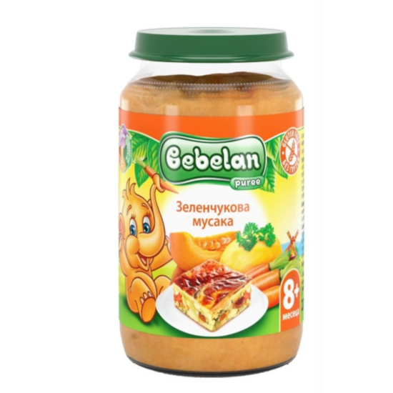БЕБЕЛАН5527 ЗЕЛЕНЧУКОВА МУСАКА 8+ 220ГР. - Стерилизирано зеленчуково ястие, подходящо за бебета след 8-месечна възраст. Здравословна и балансирана храна, съобразена с възрастта на бебето. Без добавена сол. Не съдържа консерванти, изкуствени оцветители и аромати.