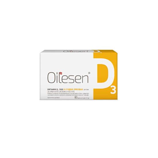 Oilesen Витамин D3 1000 IU 80 капсули e висококачествена хранителна добавка, която съдейства за функцията на имунната система и здравето на костите. Ойлесен Витамин Д3 1000 IU 80 капсули допринася за нормалното развитие и поддържането на здрави кости и зъби, като стимулира абсорбцията и усвояването на калция и фосфора. Препоръчва се при доказан дефицит на витамин Д в организма и е важен фактор за поддържане на добро здравословно състояние и висок имунитет – особено през есента и зимата.