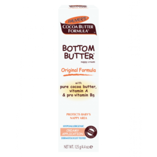 Уникална какао бътър формула крем против подсичане от Palmer's съдържаща чисто какаово масло, витамин А, Е и Д, /Провитамин Б5/, комбинирани с цел да успокоят раздразнената бебешка кожа в зоната под пелените и да я предпазят от подсичане и раздразнение. Предоставя сигурна защитна бариера срещу влагата от пелените и не позволява тя да достигне до чувствителната бебешка кожа.