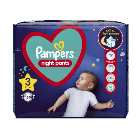 Памперс гащичките от серията "Night Pants" на "Pampers" са създадени специално за допълнителна защита на бебето през нощта. Те могат да спомогнат за спокойният сън, предлагайки отлично попиване и защита от протичане. Имат здравата сърцевина, която бързо абсорбира влагата, като по този начин осигурява сухота до 12 часа. Еластични са по цялата обиколка около кръста и краката за оптимално адаптиране към тялото.