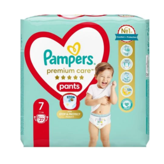 ПАМПЕРС ПРЕМИУМ КЕЪР ГАЩИ 7 /17+ кг/ Х 27БР - Памперс Премиум Кеър гащи са направени от изключително мек материал, който наподобява пух. Гарантират нежност, комфорт и фантастична мекота при допир. Вътрешния слой е лек и нежен с микропори във формата на сърца, който отвеждат влагата далеч от кожата на бебето, а микрогранулите, абсорбират до 30 пъти собственото си тегло. Микропорите пропускат свежия въздух в пелената и отвеждат влажния навън, а кожата на бебето остава суха до 12 часа. Еластичните маншети около кръста и крачетата, прилягат плътно и са удобни във всяка поза на бебето.