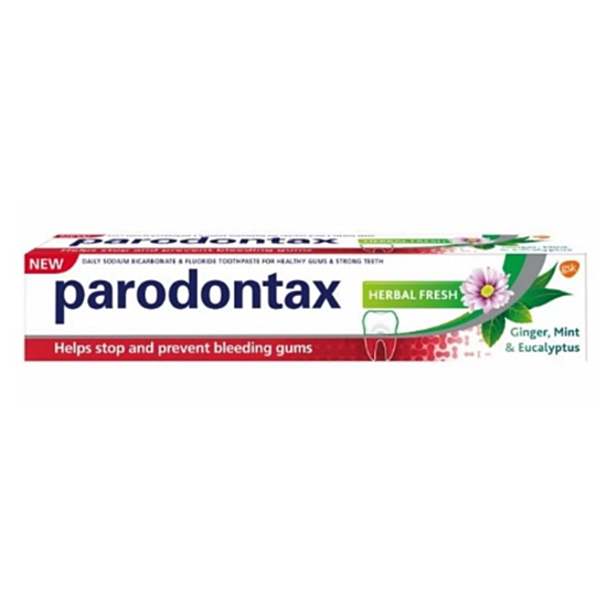 ПАРОДОНТАКС ПАСТА ЗА ЗЪБИ ХЕРБАЛ ФРЕШ 75МЛ е паста за зъби, която осигурява висококачествена грижа при кървене на венците, почиства плаката ефикасно и дарява с неповторима свежест. Редовната й употреба помага за предпазването от поява на кариес. Тя съдържа флуорид, който подпомага заздравяването на зъбите и е обогатена с екстракти от джинджифил, евкалипт и мента.