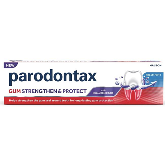 Пастата за зъби Parodontax Strengthen & Protect е с нова иновативна формула с клинично доказана технология. Активните съставки IPMP и цинк контролират натрупването на плака и имат антимикробни свойства за намаляване на бактериите. Цинкът има освежаващо действие, като улавя и елиминира лошия дъх. Обогатена с хиалуронова киселина, която е ключов градивен елемент за здрави венци.