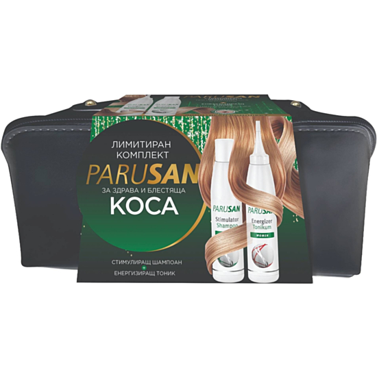 Комплектът на Parusan включва 2 страхотни продукта, които ще се погрижат за красотата и здравето на косата - стимулиращ шампоан и енергизиращият тоник за жени. А към тях има и красив несесер.