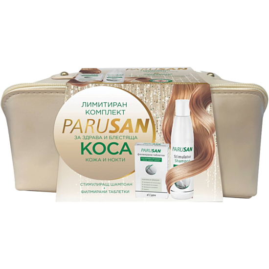 Комплектът на Parusan включва 2 страхотни продукта, които ще се погрижат за красотата и здравето на косата - стимулиращ шампоан за жени и хранителна добавка. А към тях има и красив несесер.