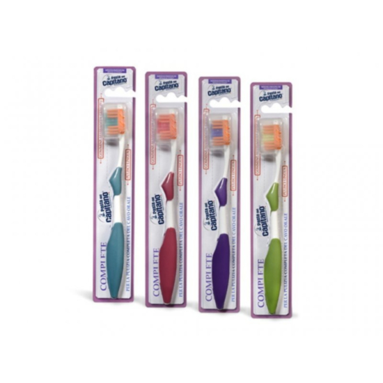 ПАСТА ДЕЛ КАПИТАНО ЧЕТКА ЗА ЗЪБИ COMPLETE MEDIUM - Тази четка е идеална за дълбоко и цялостно почистване на устната кухина. Страничните гумени части позволяват безопасно и нежно масажиране на венците. Компактната и гъвкава глава с почистваща езика част помага за премахване на бактериите, които са основната причина за лошия дъх. Отделните снопчета с влакна, които са с различни размери,ефективно почистват пространството между зъбите.