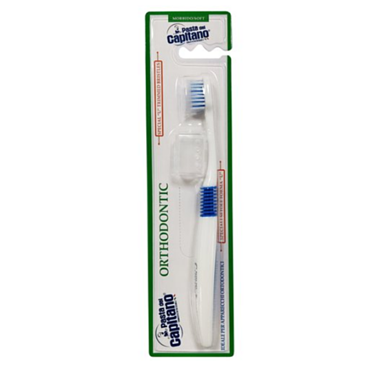 ПАСТА ДЕЛ КАПИТАНО ЧЕТКА ЗА ЗЪБИ ORTODONTIC SOFT е идеалното решение за грижа за ортодонтски апарати (брекети). Ефективността се крие в U-образните косми, които премахват плаката около жиците, брекетите и зъбите. Оптимално почистване на зъбите и венците. Четката е с удобен и безопасен захват за внимателно и прецизно почистване. За да не се износва зъбния емайл.