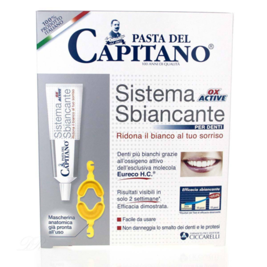 ПАСТА ДЕЛ КАПИТАНО ИЗБЕЛВАЩА СИСТЕМА OX ACTIVE SBIANCANTE 50МЛ - Ново ефективно лечение за избелване на зъбите само за 14 дни чрез лесно отстраняване и без да се атакува емайла, зъбни петна, причинени от тютюнопушенето, от вещества, богати на танини, като кафе, женско биле и червено вино.