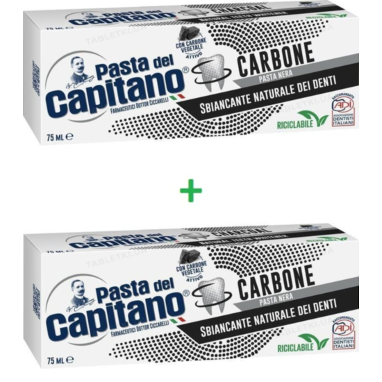 ПАСТА ДЕЛ КАПИТАНО ПАСТА ЗА ЗЪБИ С АКТИВЕН ВЪГЛЕН 75МЛ 1+1 е въглеродната паста за зъби, която предпазва, придава свеж дъх и придава на зъбите естествения им блясък. Предпазва естествения бял цвят на вашите зъби. Благодарение на активен въглен ще се насладите на дългосрочен, свеж дъх. Въглеродът абсорбира екзогенни вещества, които причиняват петна и лоши миризми.