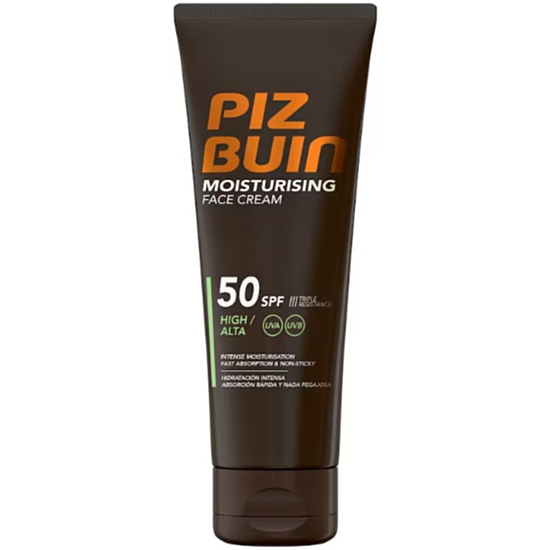 Защитете кожата на лицето си от вредните UVA/UVB лъчи със слънцезащитния крем на Piz Buin Moisturising със SPF50. Има лека текстура, която се абсорбира бързо. Осигурява хидратация през целия ден и задържа водата вътре в кожата и я предпазва от изсушаване. Предпазва кожата от слънчевата радиация и от преждевременното стареене. Защитава я от агресивни влияния като хлор, морска и солена вода. Устойчив е на пот и вода. Съдържа слънчогледово масло и витамин Е, които хидратират кожата, предпазват я от вредните слънчеви лъчи и я защитават от оксидативно увреждане, причинено от свободните радикали. Идеален за всекидневна употреба и за ползване с грим. Подходящ за всеки тип кожа. Тройна защита: Съдържа усъвършенствани UVA/UVB филтри за моментална и ефективна защита. Широк спектър. Попива бързо, без бели следи. Немазен и нелепкав.