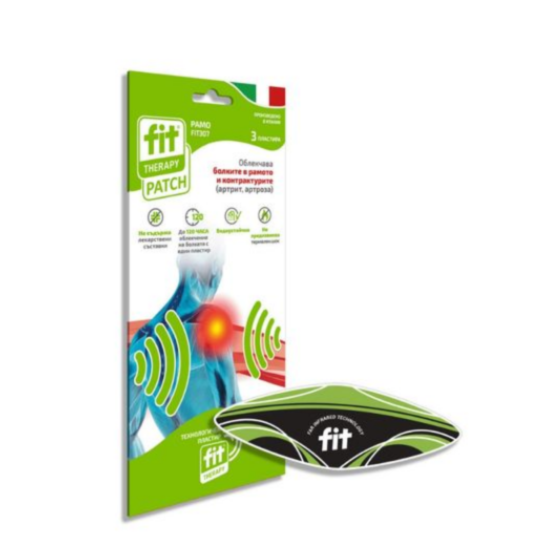 ПЛАСТИР ФИТ ТЕРАПИЯ ЗА РАМО Х 3 са предназначени за облекчаване на болките в рамото и контрактурите в резултат на артрит, артроза. Тяхната основа е изработена от 100% нетъкан полипропиленов текстил и специална прахообразна смес от титанови диоксиди, която има свойството да отразява далечните инфрачервени лъчи (FIR), излъчвани от клетките на тялото. Отразените инфрачервени лъчи се връщат обратно и проникват дълбоко в тялото и по този начин активират клетките му. Това води до физическо облекчаване на болките, чрез генериране на топлина дълбоко в мускулите и засилване на кръвообращението, особено в областта, където е поставен пластира. Пластирите за рамо Fit Therapy постигат обезболяващ ефект, който се дължи на подобрената микроциркулация, без да съдържат лекарствени съставки и без да водят до осезаемо затопляне на мястото на прилагане. Действието им може да се прояви до няколко минути, но не по-късно от 24 часа след поставянето им и обезболяващия ефект продължава до 5 дни. Пластирите са водоустойчиви и тяхното действие продължава, дори и след намокряне (например по време на къпане). Изработени от висококачествени материали, те са деликатни, прилепват плътно към кожата и не причиняват раздразнения. Това ги прави безопасни и подходящи за продължителна употреба. FIT THERAPY технологията може да бъде приложена към различни части на тялото за облекчаване на мускулно-скелетни болки в резултат от претоварване или лека травма, както и в хода на възстановяване на мускулните тъкани, тъй като наред с облекчаващото действие, пластирите имат и миорелаксиращ ефект върху засегнатата мускулна област.