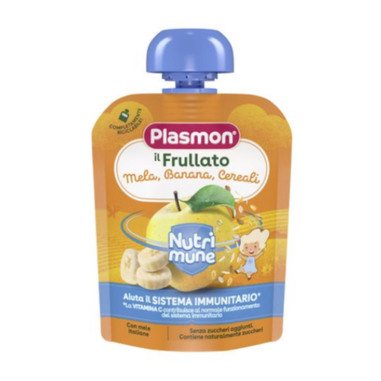 ПЛАЗМОН 1602 ПЛОДОВА ЗАКУСКА С ЯБЪЛКА,БАНАН И МЮСЛИ 6М+ 85ГР. е 100% натурален, пастьоризиран продукт без добавена захар с италиански ябълки. Подпомага имунната система*, ръчно избрани плодове в точния момент на узряване. Гарантирана проследяемост на суровините и контрол на всички фази на производство по системата за безопасност и качество Oasi nella Crescita. Напълно рециклируема опаковка.