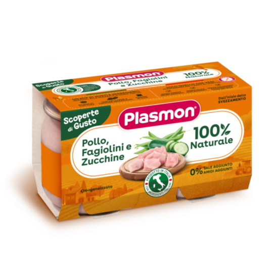 Бебешка храна, хомогенизираното пюре с пилешко, зелен фасул и тиквички Plasmon е продукт, даван от началото на захранването, освен ако педиатърът не е препоръчал друго.