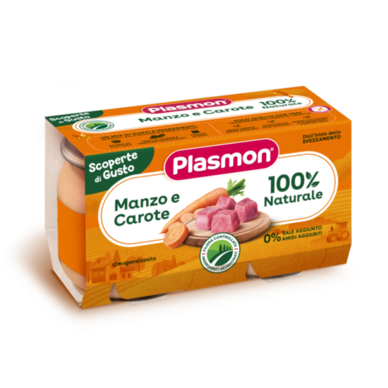Бебешка храна, хомогенизираното пюре говеждо и моркови Plasmon е продукт, даван от началото на захранването, освен ако педиатърът не е препоръчал друго.