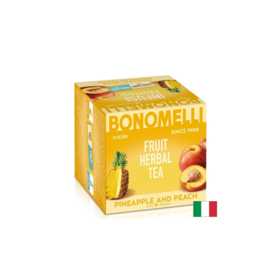 Infusion Fruits Pineapple and Peach на италианската компания Bonomelli е 100% натурална и висококачествена плодова смес, която съдържа в състава си екстракт от цветовете на червен хибискус, сок от ананас, сок от праскова, ябълка, шипка и екстракт от корен от сладник. Допринася за подобряване на храносмилателните процеси и помага за облекчаване на симптоми като подуване на корема, газове и запек. Осигурява антиоксидантна защита и предпазва клетките на тялото от вредното действие на оксидативния стрес и свободните радикали. Освен това подкрепя функциите на имунната система, повишава защитните сили на организма, помага в борбата с инфекциите, вирусите и патогените и се бори с различни възпалителни процеси в тялото. Балансира, действа освежаващо и хидратира тялото.