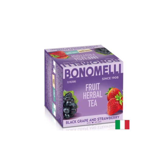 Infusion Frutosi Black Grape and Strawberry на италианската компания Bonomelli е натурална и висококачествена билкова смес, която съдържа в състава си екстракт от хибискус, черно грозде, ягоди, ябълка, шипка, бъз и екстракт от корен от сладник. Благодарение на високото съдържание на антиоксидантни и полифенолни съединения в черното грозде и антиоксидантите и флавоноидите в ягодите, този чай защитава клетките от вредното действие на оксидативния стрес и свободните радикали. Освен това се грижи за сърдечно-съдовото здраве, намалява риска от сърдечни заболявания, спомага за намаляване нивата на лошия холестерол в кръвта и контролира нивата на кръвното налягане. Тази билкова смес подкрепя функциите на имунната система, повишава защитните сили на организма, помага в борбата с инфекциите, вирусите и патогените и и се бори с различни възпалителни процеси в тялото.