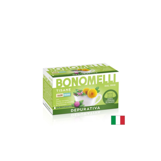 Tisane Depurativa на италианската компания Bonomelli е висококачествена билкова смес, която съдържа в състава си екстракт от лимонена трева, зелен чай, бял трън, куркума, листа от бреза, мечо грозде и глухарче. Оказва противовъзпалително и пречистващо действие и насърчава естествената детоксикация на организма. Оказва благоприятен ефект на отделителната система, спомага за изхвърлянето на токсините и излишните течности от тялото и подпомага метаболитното здраве. Подобрява функциите на пикочните пътища, бъбреците и черния дроб и насърчава детоксикацията на чернодробните клетки. Този билков чай подпомага храносмилателните процеси и допринася за предотвратяване на стомашни неразположения като болка, подут корем, запек, диария и газове. Допринася за контрола на кръвната захар и кръвното налягане и намалява нивата на лошия холестерол в кръвта, подкрепя функциите на имунната система и повишава защитните сили на организма.