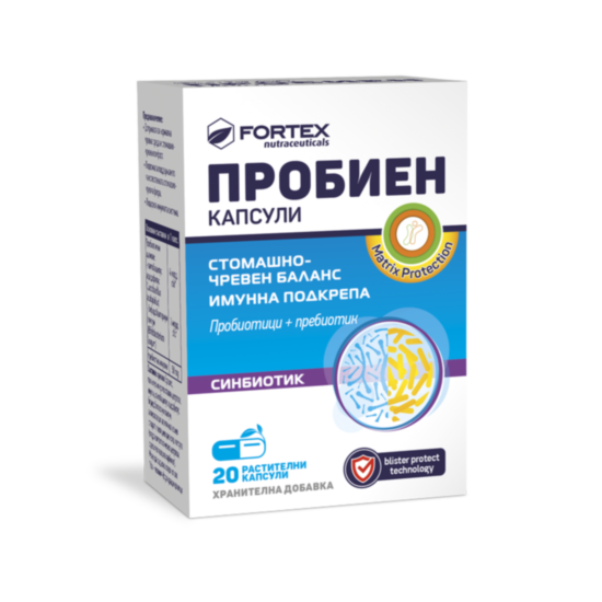Хранителната добавка Пробиен от Fortex е синбиотик, който е перфектна комбинация от пробиотици и пребиотик. Той подобрява и регулира вътрешния микробен баланс на стомашно-чревния тракт. Освен това потиска развитието на болестотворни бактерии и осигурява правилно храносмилане. Препоръчва се за профилактика при заболявания като колит, диария и запек. Хранителната добавка се грижи за нивата на холестерола и подсилва имунитета. При антибиотична терапия намалява страничните ефекти.