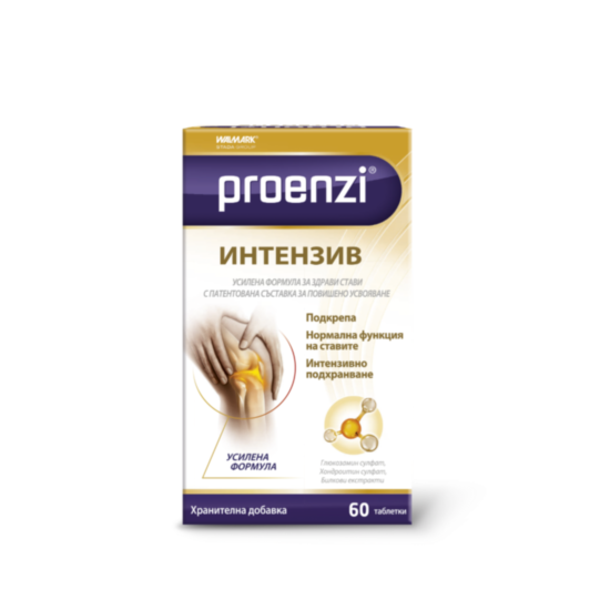 Проензи Интензив на Валмарк е хранителна добавка, която съдържа комплекс от растителни есктракти и се грижи за здравето на ставите.Обогатената концентрирана формула на Проензи Интензив оказва благоприятно въздействие върху ставите, като спомага за гъвкавостта и улеснява движението на тялото. В продукта се съдържат растителни екстракти от бяла върба, тамяново дърво куркума, които се използват от хилядолетия в Аюрведа. Тези натурални съставки са известни със своите полезни свойства като допринасят за по-добра подвижност и гъвкавост на ставите. В Проензи Интензив е добавен и витамин C, който има принос във формирането на колаген и нормалното функциониране на ставите и хрущялите. Продуктът Проензи Интензив се препоръчва за поддържане на доброто здраве на всички стави, както коленни и тазобедрени, така и на гръбначния стълб и малките стави на ръцете.