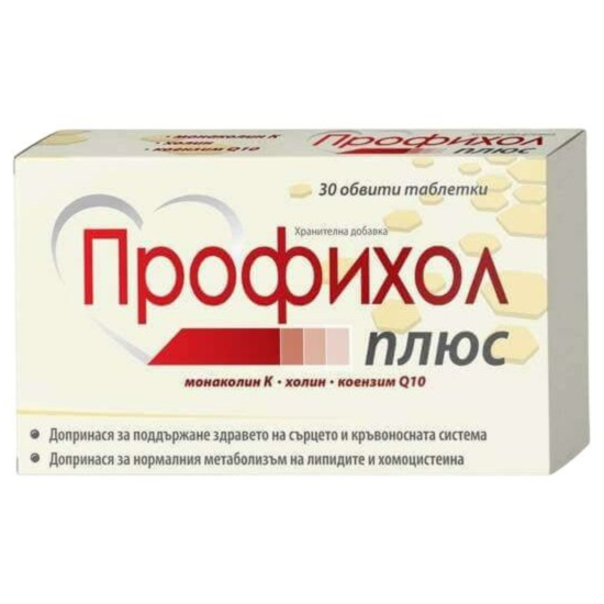 Профихол Плюс е иновативна хранителна добавка, специално разработена за поддържане на здравето на сърдечно-съдовата система. Съдържа ферментирал червен ориз, богат на Монаколин К. Добавените холин и коензим Q10 усилват ефекта, като подпомагат нормалната функция на черния дроб и защитават клетките от оксидативен стрес. Добавеният холин допринася за нормалния метаболизъм на липидите и хомоцистеина, а също така поддържа здравето на черния дроб. Коензим Q10, известен със своите антиоксидантни свойства, забавя процесите на стареене и подобрява функцията на сърцето и кръвоносните съдове.Подходящо за възрастни над 18 години, които искат да поддържат своята сърдечно-съдова функция и да защитят организма си от оксидативен стрес.