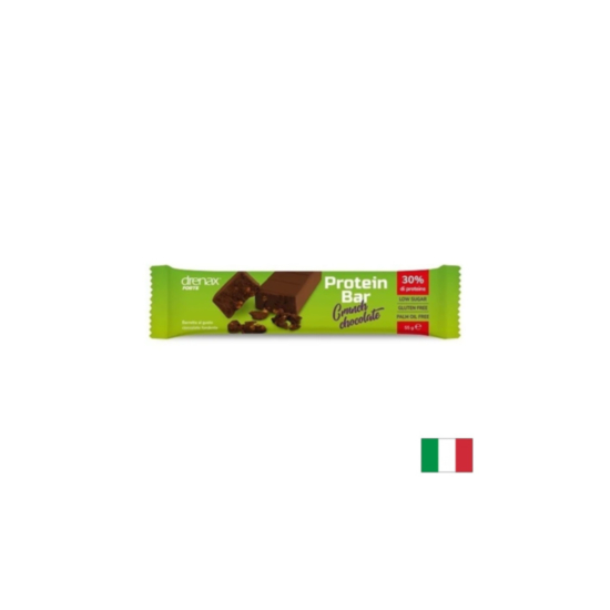 Drenax forte Protein Bar – Crunch chocolate от серията продукти на италианския бранд Paladin Pharma e протеинов бар с вкус на тъмен шоколад . С ниско съдържание на захар и високо съдържание на протеини, това е идеалният бар за тези, които следват балансирана диета, но искат да поглезят вкуса си.