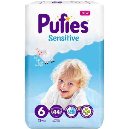 Пелени за еднократна употреба, обогатени с екстракти от лайка и алое, които защиват кожата от подсичане, раздразнение и зачервяване. Изработени от мека, дишаща материя. Те задържат влагата далеч от кожата на бебето, благодарение на каналчетата за сухота и хипоалергенния слой с копринени нишки. Специалните каналчета попиват отлично и оставят дълготрайно чувство за комфорт и сигурност. Добавени екстракти от лайка и алое вера осигуряват мек и нежен допир до бебешката кожа. Пуфис имат гъвкаво коланче и идеално прилягащи еластични ленти със специални бариери, които предпазват пелената от протичане.
