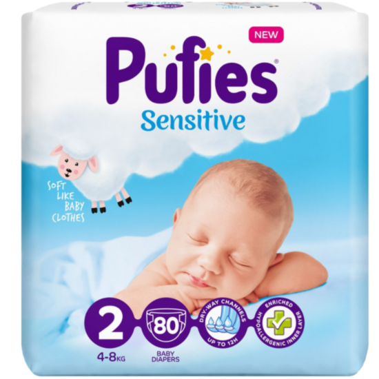 Pufies Sensitive са ново поколение пелени с абсорбиращи каналчета за по-бързо попиване в сравнение с предишните пелени Pufies. Създадени специално за да осигурят максимален комфорт и отлична защита срещу протичане. Пелените са с точно прилягащи ластици, а областта oкoлo крaчeтaтa e зaщитeнa cъс специални бариери, които не допускат протичане. Pufies Sensitive са изработени от изключително мека и тънка материя, която позволява пелената да диша, тя остава суха дълго време, а нежната бебешка кожа е предпазена от зачервяване и подсичане.