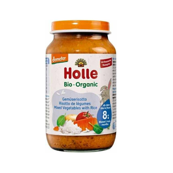 ПЮРЕ РИЗОТО СЪС ЗЕЛЕНЧУЦИ 220ГР HOLLE ДЕМЕТЕР - Холе ризото със зеленчуци предназначено за хранене на бебета от 8-мия месец. Идеално за обяд. Вкусно и балансирано, съобразено с нуждите на подрастващите. To е създадено от продукти, отгледани по методите на биологичното земеделие, без наличието на консерванти и химикали. Има чудесен вкус и е лесно смилаемо.